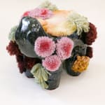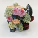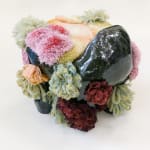 An organic ceramics loung chair with multiple dripping glazes forms a rock land with wool embroideries blooming out of its cavities.